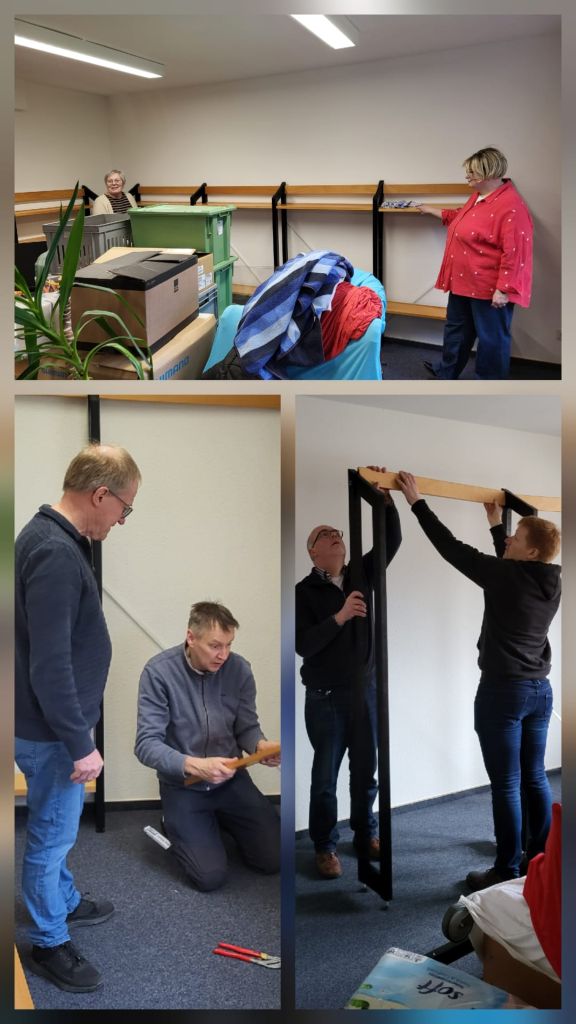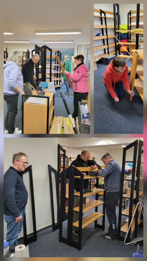 Die Malerarbeiten sind nun abgeschlossen. Im hinteren Teil der Bücherei konnten also die Regale für Bücher, CD’s und Spiele wieder aufgebaut und dem neuen Plan entsprechend positioniert werden.