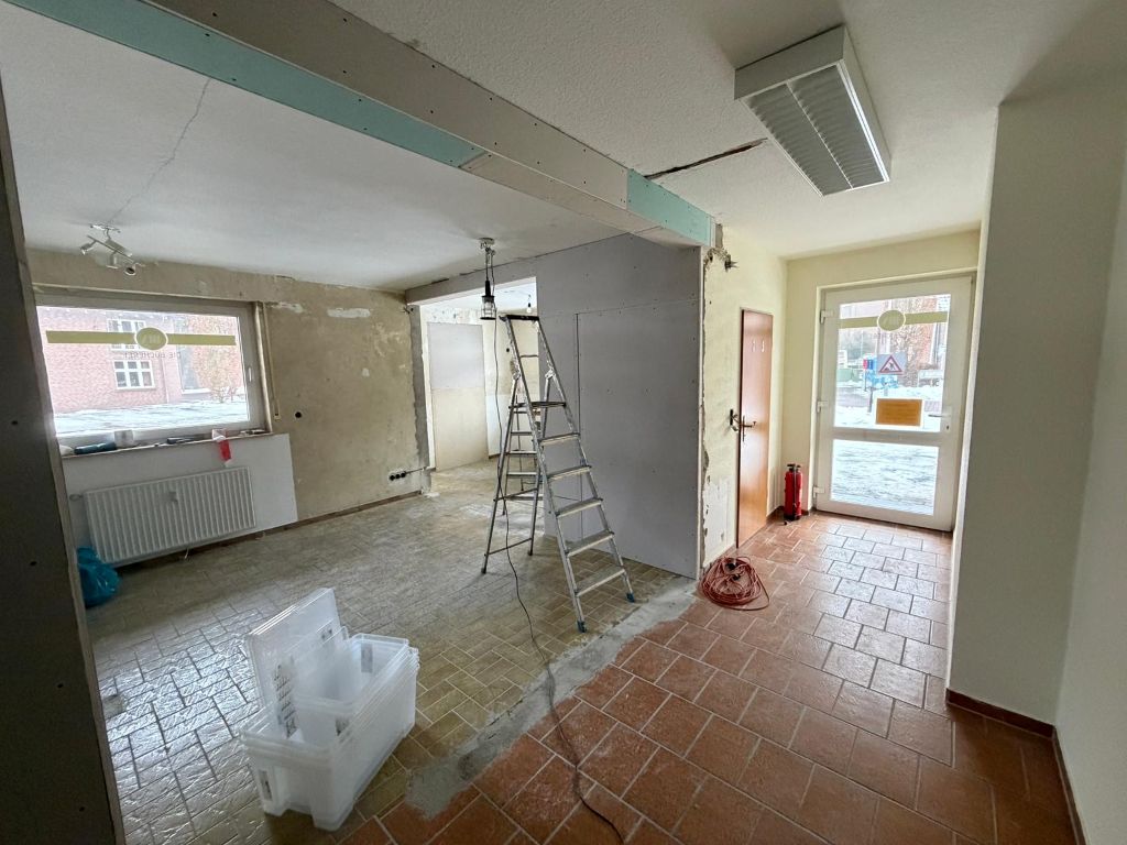 Nach Elektrikerarbeiten, dem Entfernen des Steinstaubes und dem Anbringen von Regipsplatten zeigt der aktuelle Blick in die Baustelle: es wird richtig schön hell werden demnächst in der Bücherei.